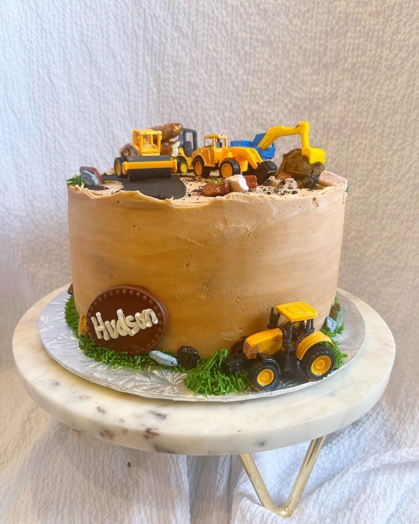 Construction themed birthday party cakes reach new creative heights with this design that captivates both children and adults. Green buttercream “grass” piping around the base provides natural landscaping while additional toy vehicles continue the theme at ground level. This cake serves as both dessert and entertainment, giving kids endless opportunities to explore the sweet construction site before diving into delicious layers beneath all that creative decorating.