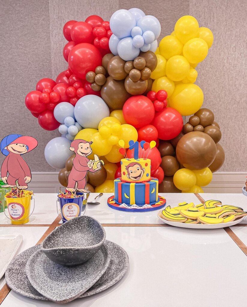 Your little guests will gasp with delight when they spot this towering balloon creation alongside the themed birthday cake. The coordinated table setting features George cutouts and party supplies that tie the whole look together beautifully. Those granite serving pieces add an unexpected elegant touch while keeping the focus on fun.