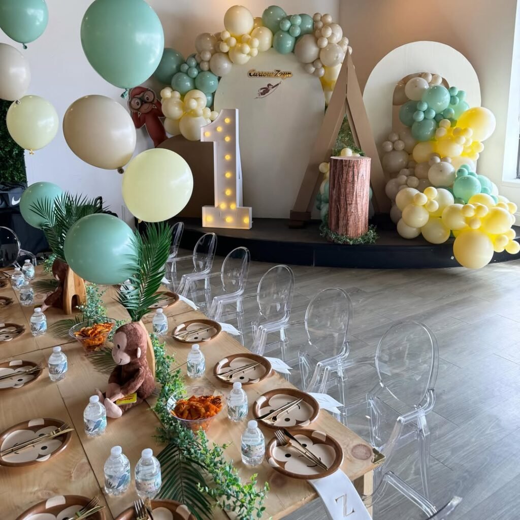 Those clear ghost chairs give the setup a contemporary feel that parents love while the monkey-themed place settings keep kids excited about their seats. The illuminated number marquee adds that special birthday glow without overwhelming the elegant color palette. Each table setting includes thoughtful details that make every guest feel special.
