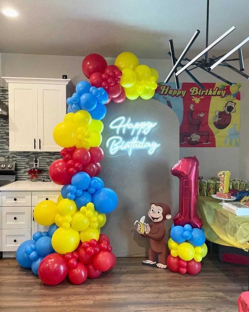 Bring contemporary style to classic curious george birthday party ideas with this sleek balloon installation that transforms any modern space into a celebration venue. The organic balloon arch flows naturally around the neon birthday sign, creating that Instagram-worthy backdrop parents love while maintaining kid-friendly appeal.