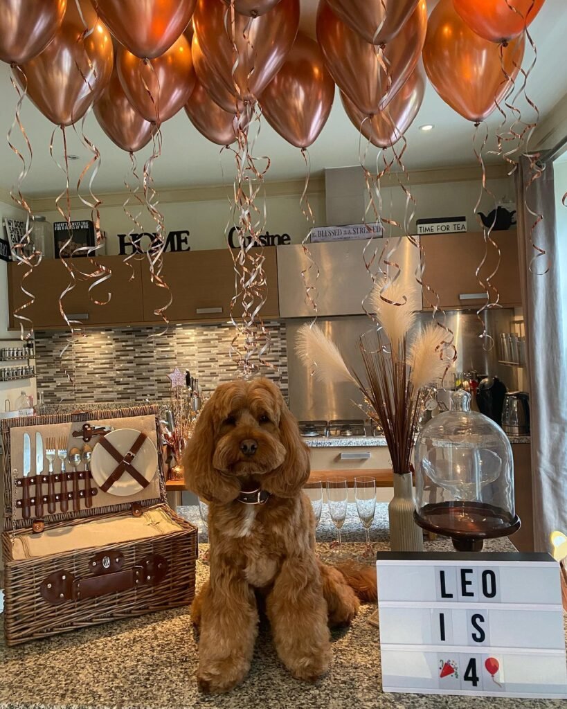 This elegant kitchen setup features gorgeous rose gold balloons that create a warm, luxurious atmosphere. The “LEO IS 4” sign adds a personal touch, while the basket and glass dome suggest special treats are coming.
