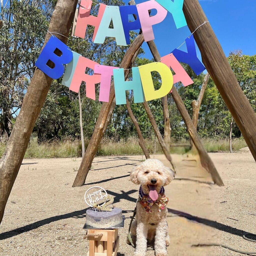 This setup shows how a simple “HAPPY BIRTHDAY” banner and some props can transform any outdoor space into a party venue. The natural lighting makes everything look gorgeous, and your pup gets to enjoy fresh air while celebrating.