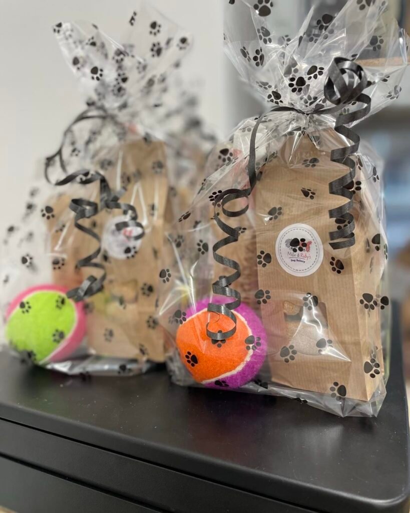 Each bag contains special treats and toys that guest dogs can enjoy. The paw print cellophane bags with ribbon bows look so professional and cute. You could include homemade dog treats, a small toy, or even a tennis ball.