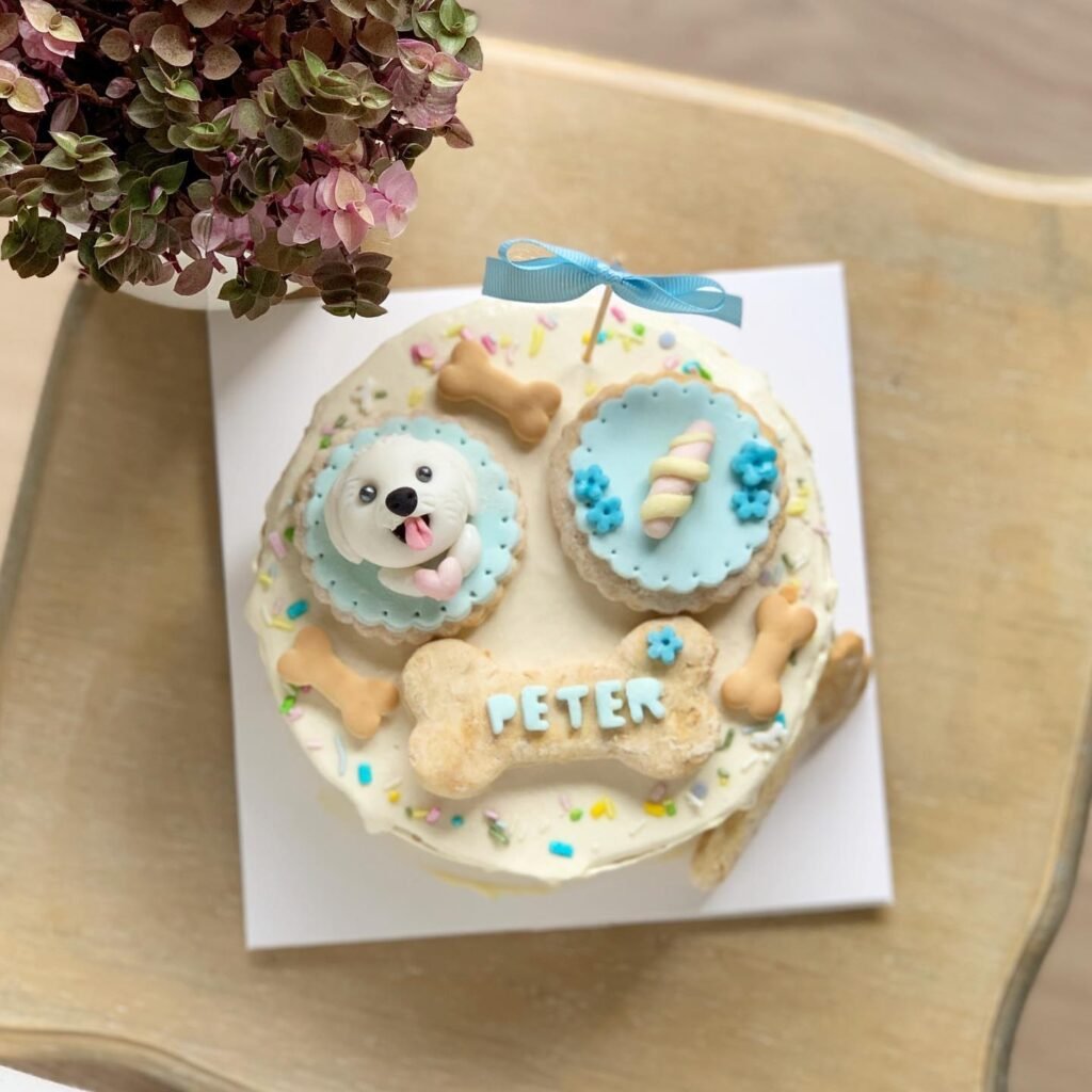 This charming cake features a cute puppy face design with blue icing, complete with a little pink tongue and happy expression. The bone-shaped decorations and “PETER” name plate make it extra personal.