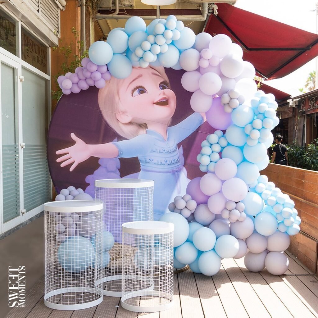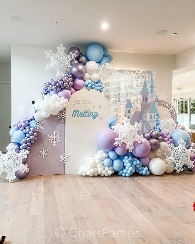 The balloons’ varying sizes and soft color gradient from ice blue to lavender purple capture that dreamy, ethereal feeling of Elsa’s ice palace, making every guest feel like they’ve stepped into the movie.