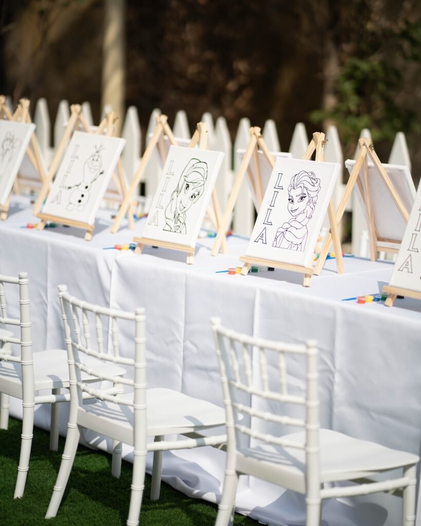 This activity works perfectly as both entertainment and a take-home craft, giving kids something meaningful to remember the celebration by. The white chiavari chairs add an elegant touch to this creative corner.