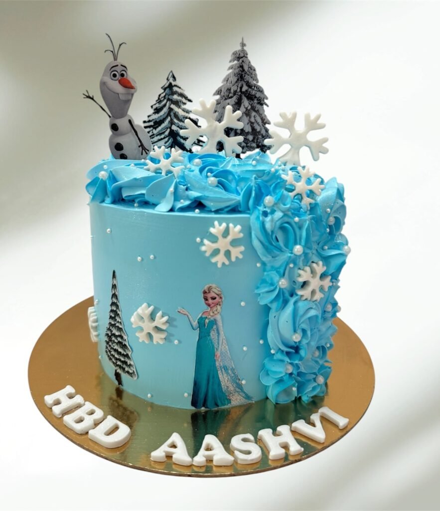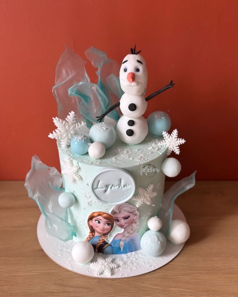 The beautiful two-tier design features soft blue and white frosting, perfectly complemented by delicate snowflakes and an adorable Olaf topper.