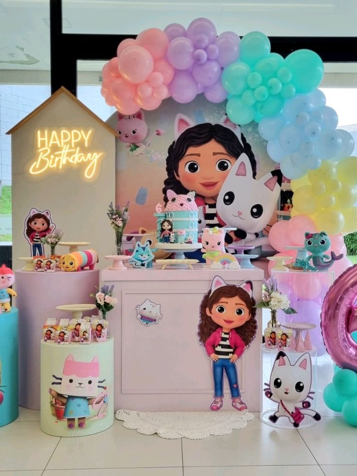 This festive display is a captivating setup for a Gabby’s Dollhouse birthday party. A neon “Happy Birthday” sign glows from a small dollhouse, creating a cheerful focal point. Character standees of Gabby and her friends bring the scene to life.