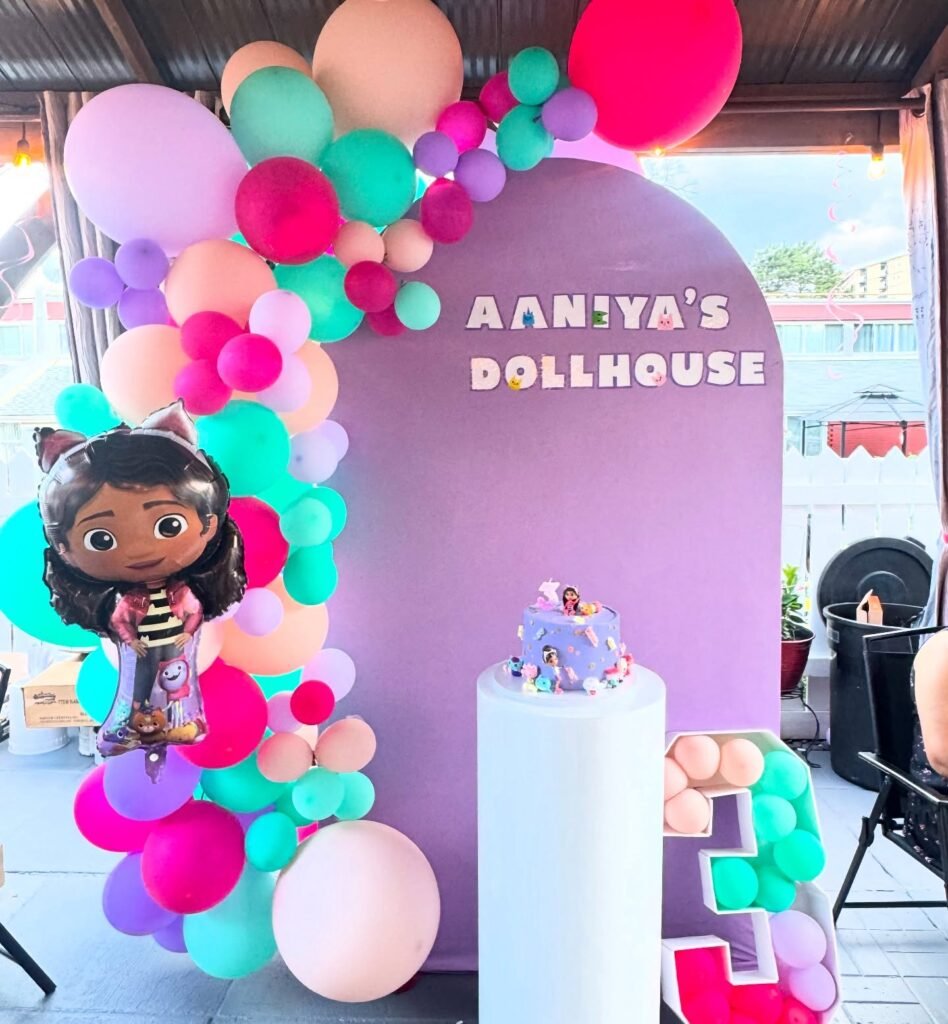 This charming Gabby’s Dollhouse birthday party corner features a personalized backdrop. It proudly displays “AANIYA’S DOLLHOUSE,” making the celebration unique. A whimsical balloon arch in pastel and bright colors cascades beautifully.