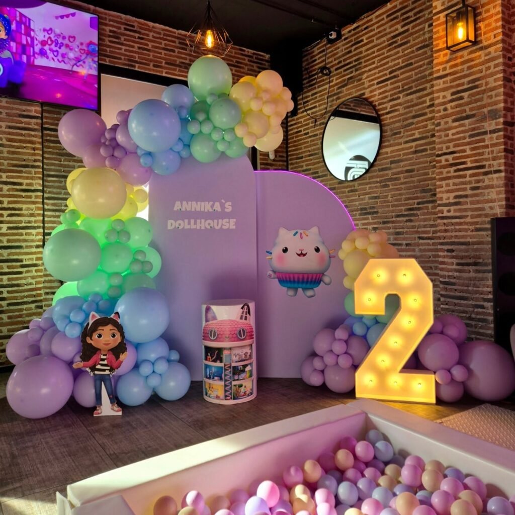 A giant light-up number ‘2’ stands out, celebrating a special second birthday. Gabby and her cat friends in various cutouts add a fun, personal touch. A ball pit in the foreground adds a fun play area.