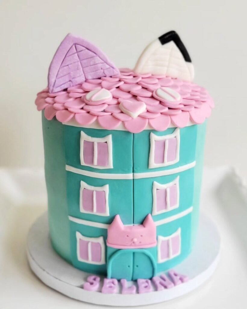 This cake is a custom-made masterpiece for a Gabby’s Dollhouse birthday party. Shaped like the iconic dollhouse, it features a teal and pink color scheme. Pink shingles and white windows create a playful, familiar look.