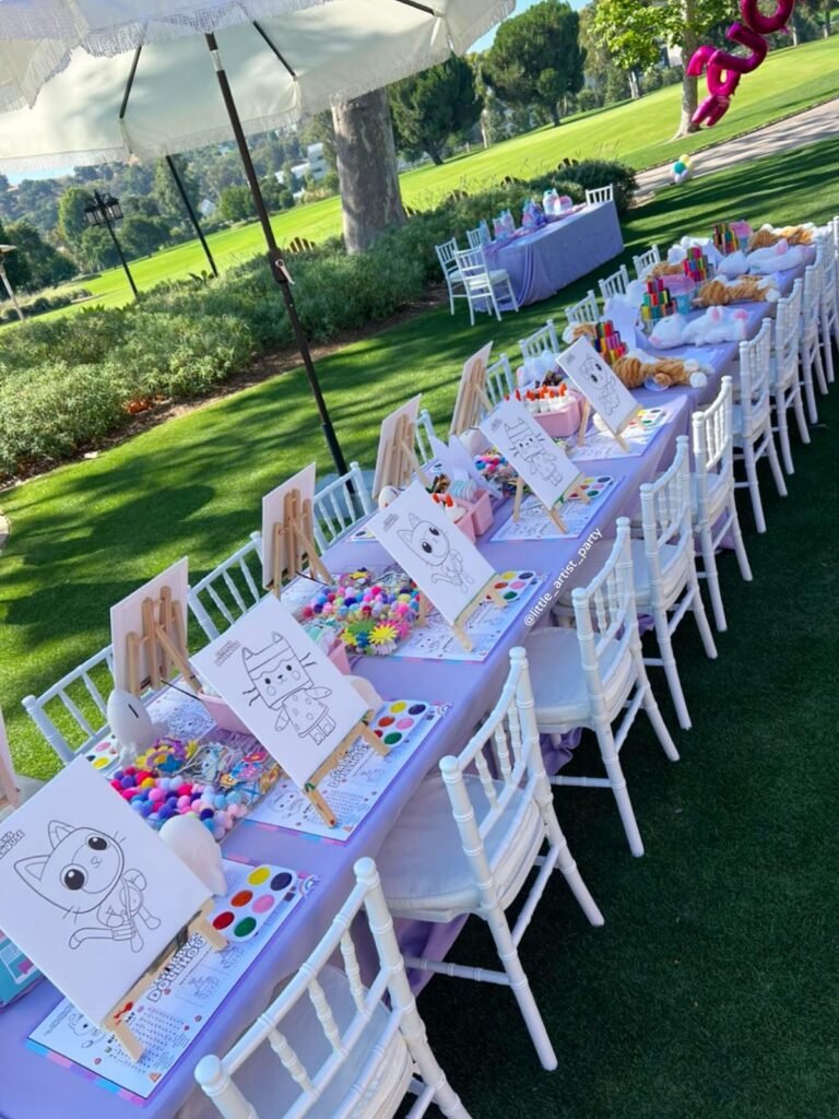 This practical activity station is a perfect addition. It allows kids to express themselves while celebrating the theme. It’s a very engaging idea for a Gabby’s Dollhouse birthday party.