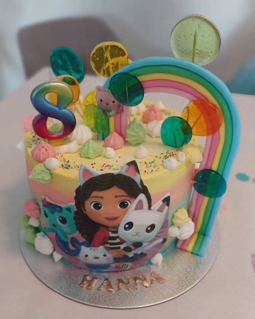 Custom gold lettering spells out “HANNA,” making the cake truly personal. This dessert is both beautiful and delicious, sure to be a hit. It captures the fun spirit of a Gabby’s Dollhouse birthday party.