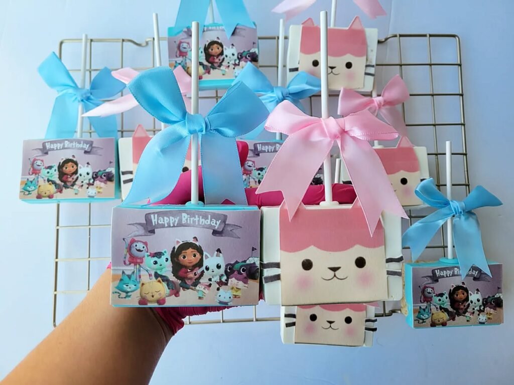 These adorable Gabby’s Dollhouse birthday party favors are a sweet goodbye gift for guests. Each one is a chocolate-covered treat on a stick, decorated with the show’s characters. The boxes feature cheerful “Happy Birthday” messages.