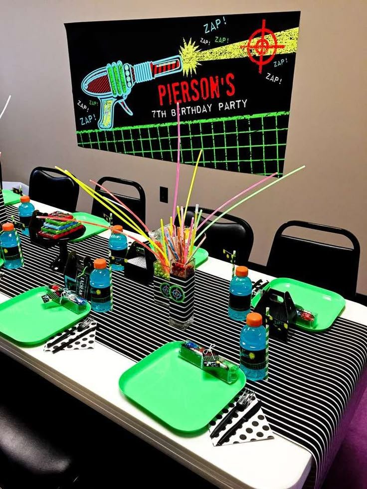 This engaging table setup promises an exciting laser tag birthday party experience for every guest. A large, dynamic backdrop immediately captures attention, featuring a stylized laser blaster with “ZAP!” sound effects and a prominent target graphic. Bold text announces “PIERSON’S 7TH BIRTHDAY PARTY,” adding a wonderful personal touch to the celebration. The black background with neon green grid lines effectively mimics the atmosphere of a laser tag arena.