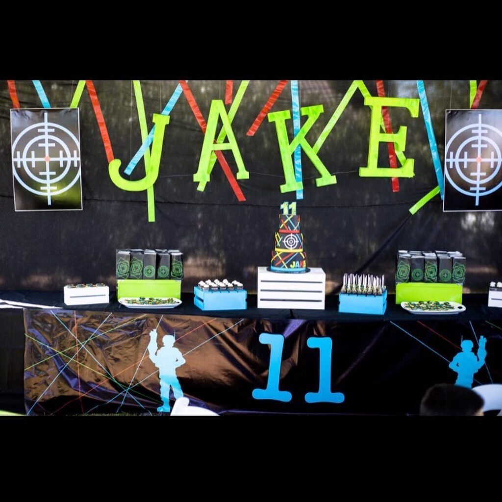 This vibrant display showcases a fantastic setup for a laser tag birthday party, full of energy and thematic details. A dark backdrop truly makes the neon green and blue “JAKE” lettering pop, immediately personalizing the celebration. Large target graphics flank the name, reinforcing the exciting game theme. Colorful streamers in red, blue, and green add a lively touch, mimicking the fast paced action of a laser arena.