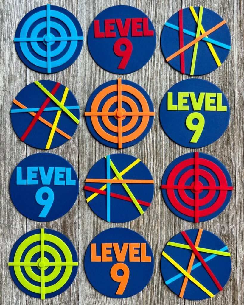 Vibrant laser beam patterns crisscross each topper in neon yellow, orange, and red, creating visual drama that makes kids’ eyes light up. The precision craftsmanship in these edible decorations shows how small details can transform ordinary cupcakes into party centerpieces. Multiple target variations ensure every guest gets a unique design.
