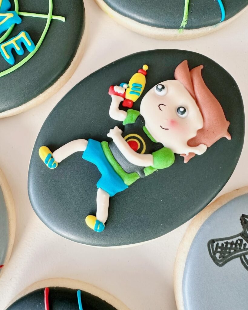 This charming cookie features an adorable fondant character, making it a standout treat for a laser tag birthday party. The detailed figure, with its vibrant green shirt, blue shorts, and bright yellow shoes, is expertly crafted and full of personality. Clutched in the character’s hands is a small, colorful laser blaster, ready for action, instantly tying into the exciting game theme.