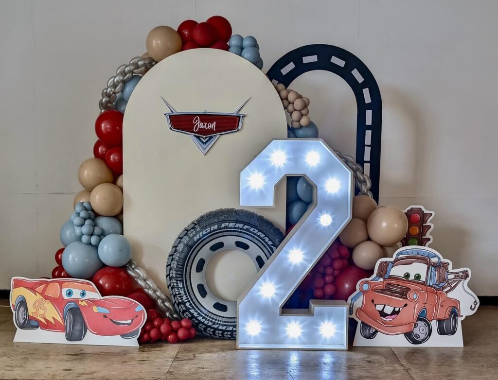 Bring Hollywood glamour to your Lightning McQueen birthday party with this illuminated number display. The LED-lit “2” creates stunning visual impact while balloon garlands in racing colors frame the entire setup. Custom Cars logo featuring “Jaxon” makes this celebration uniquely personal and memorable.