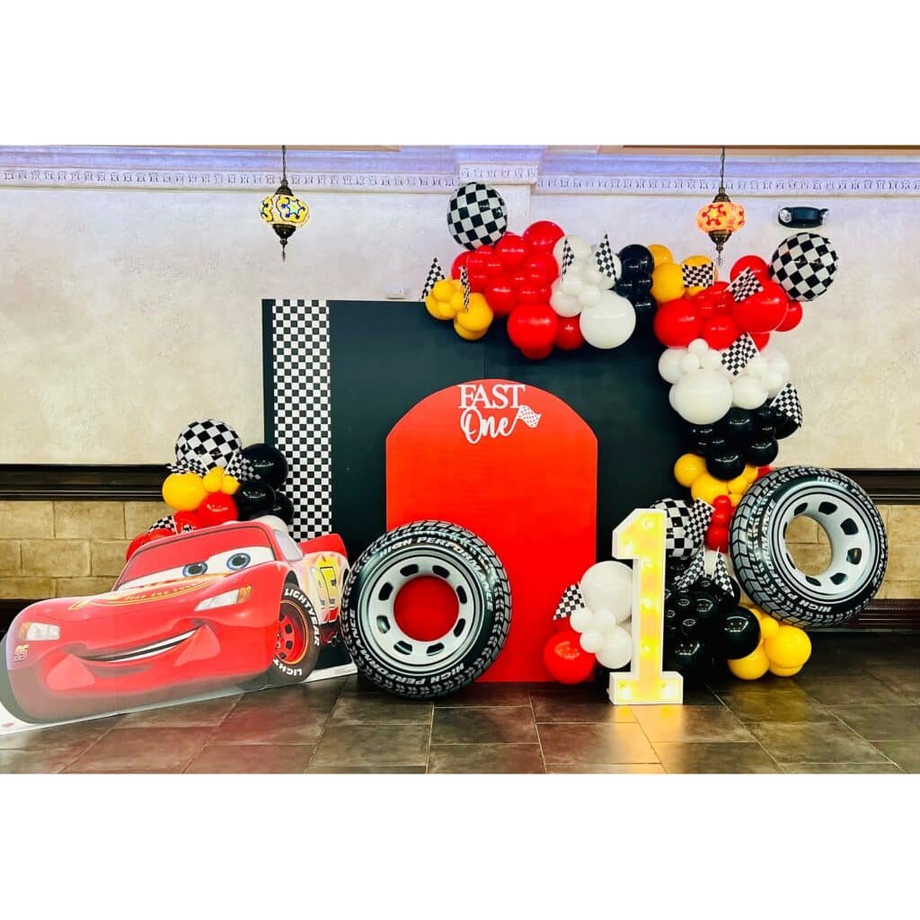 Professional staging makes this Lightning McQueen birthday party backdrop photograph beautifully from every angle. The illuminated “1” ensures the age celebration remains the focal point while racing elements provide thematic support and visual excitement for all party guests.