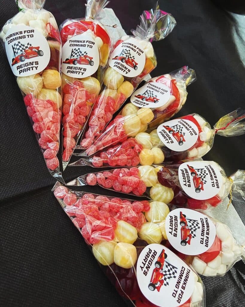 Send guests home with sweet memories using these custom Lightning McQueen birthday party favor cones. Each cone features Reign’s personalized racing car design with checkered flags, creating cohesive party branding. The red and yellow candy colors match Lightning McQueen’s signature racing scheme perfectly.