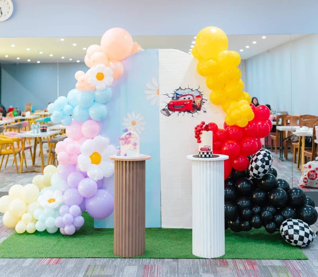 The genius lies in layering different balloon sizes and shapes to create visual depth. Lightning McQueen character balloons peek through the arrangement, making children feel like they’re celebrating with their favorite racer.