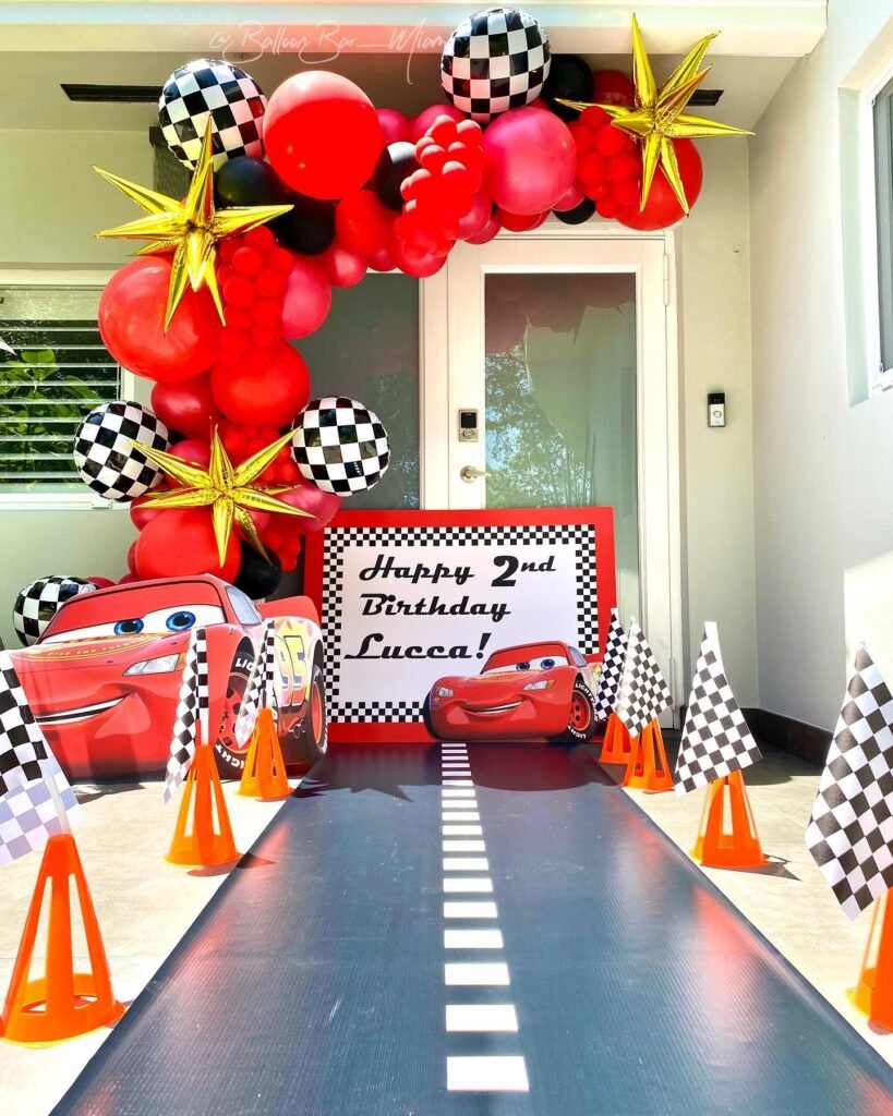 From simple balloon arrangements to elaborate outdoor racing towns, each setup demonstrates unique ways to bring the beloved Cars universe to life.
