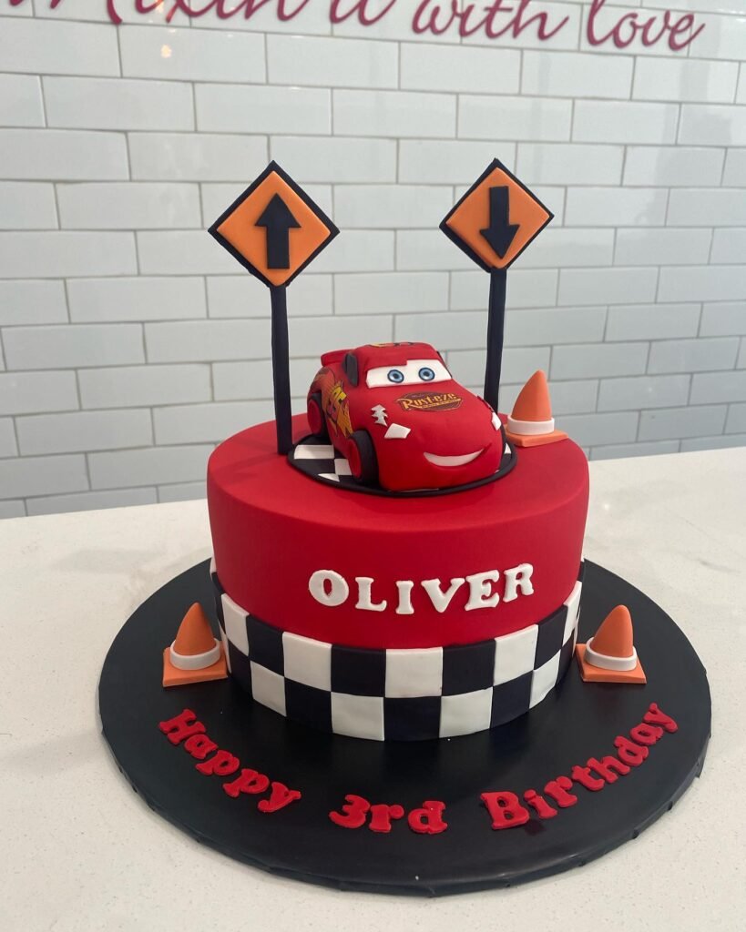 Orange traffic cones positioned around the cake create a complete racing scene. The “Happy 3rd Birthday” message on the black base makes this Lightning McQueen birthday party cake age-appropriate and personal. “OLIVER” proudly displayed ensures the birthday star feels special.