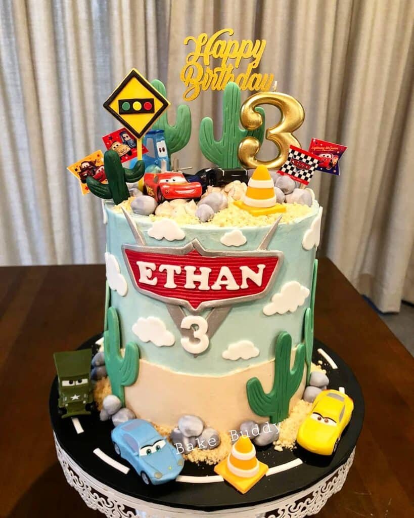 The light blue sky layer contrasts beautifully with the sandy desert base. This Lightning McQueen birthday party cake tells a story while celebrating Ethan’s special day. Yellow car figures add variety beyond the main Lightning McQueen character.