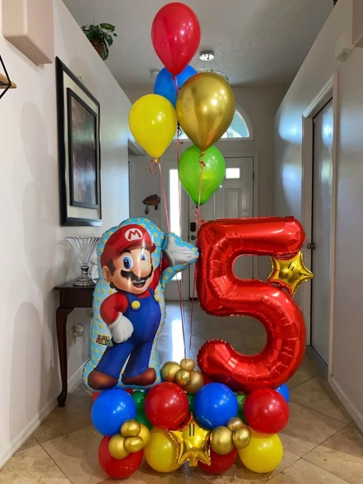 This fun balloon bouquet is a great way to celebrate a Mario birthday party. A huge red number “5” shows the birthday age. A large foil balloon of Mario greets everyone with a wave.