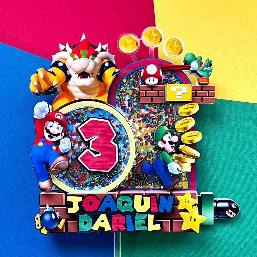 The shaker-style “3” adds a fun, interactive element. The personalized “JOAQUIN DARIEL” text makes it a special keepsake. Details like the Bullet Bill and stars complete the scene.