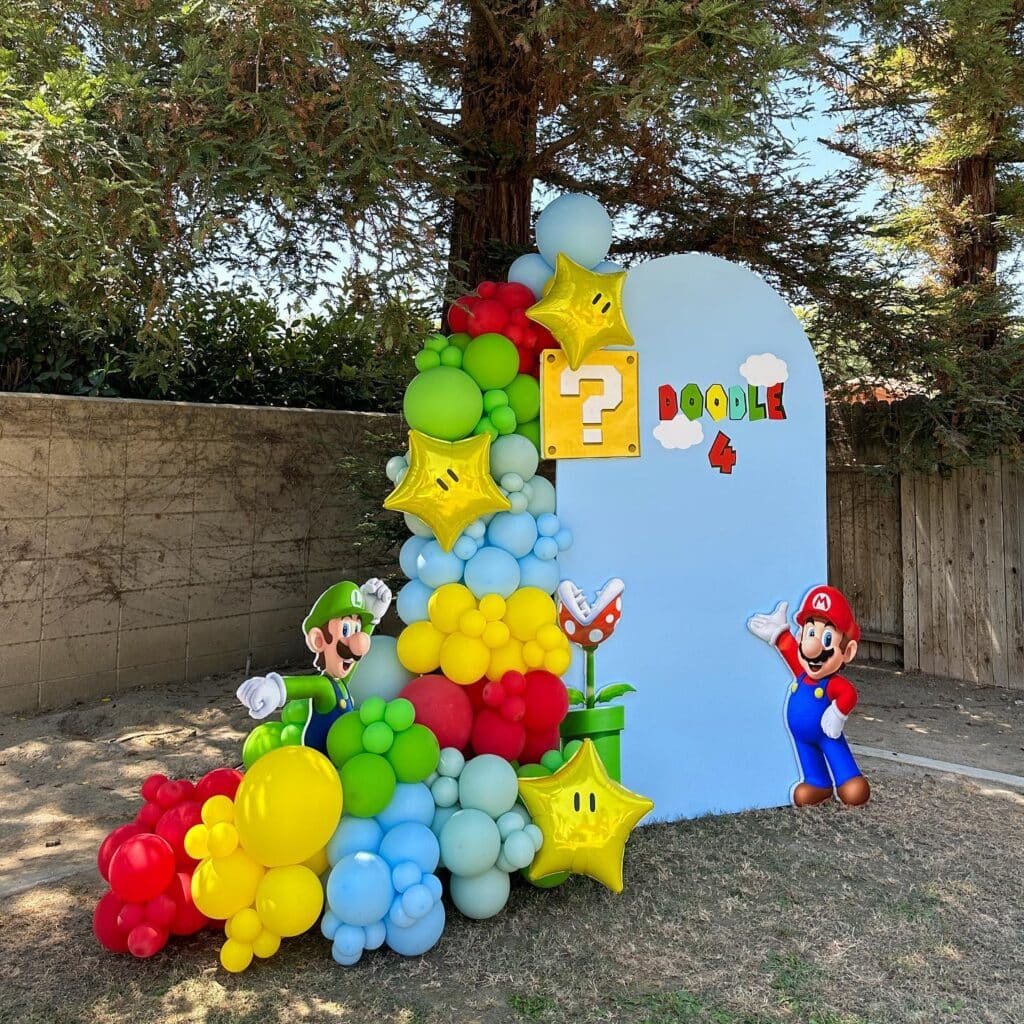 Iconic elements like the question block and Piranha Plant transport guests to the Mushroom Kingdom. The “DOODLE 4” sign celebrates the birthday child’s age. It’s a true Super Mario welcome.