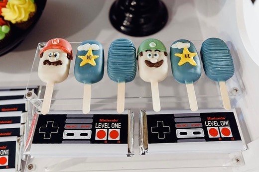 These fun cake pops are a great treat for any Mario birthday party. They are decorated to look like different power-up items. Each one features a classic character on top.
