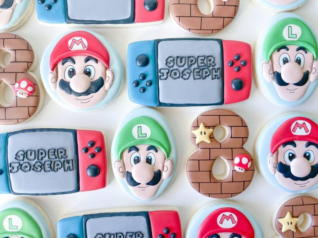 These decorated cookies are a delicious way to celebrate your Mario birthday party. Shaped like classic characters and game consoles, they are a fantastic treat. Each one is a work of edible art.