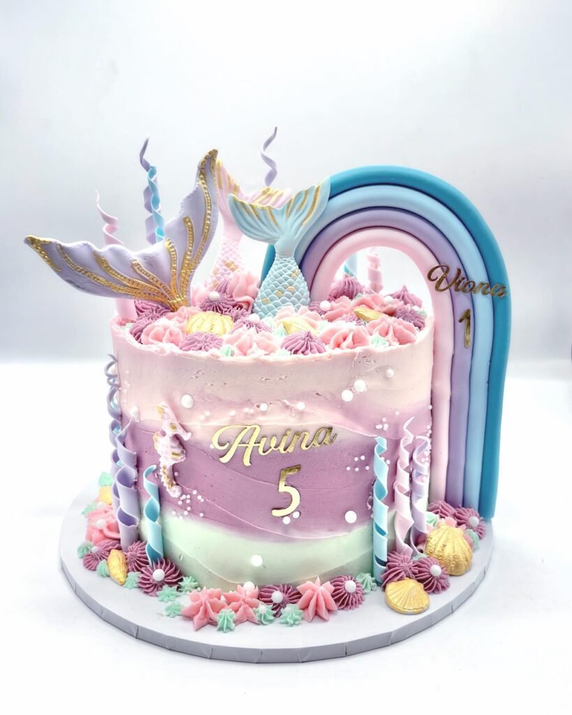 This magical cake is a double celebration for Avina and Diora. A beautiful rainbow arch frames the top, featuring mermaid tails with shimmering scales.