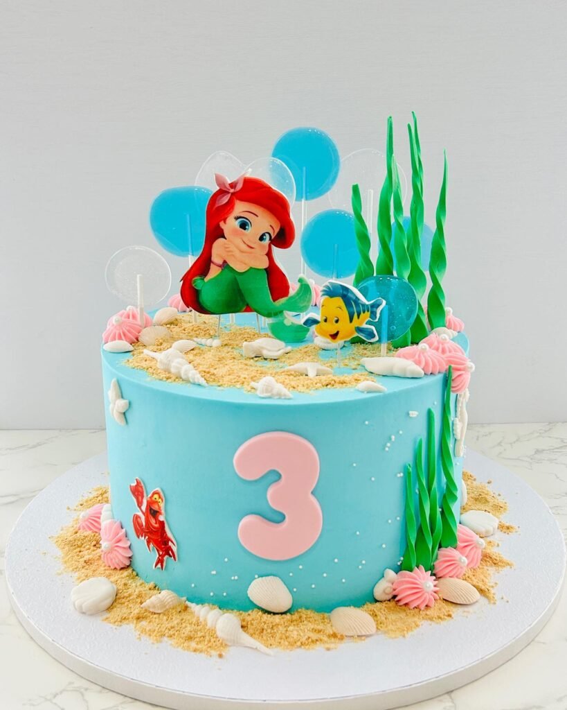 This cheerful cake features a happy Ariel and Flounder, ready to celebrate a third birthday. The top is covered in edible “sand,” with sugar seashells and candy bubbles scattered around them.
