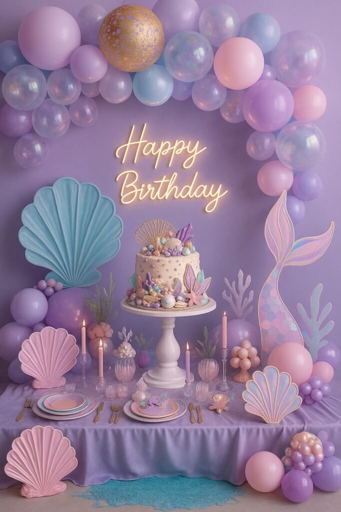 The entire scene, including a beautiful mermaid tail, coral cutouts, and pastel balloons, is a feast for the eyes. A neon “Happy Birthday” sign illuminates the elegant, underwater-themed table.