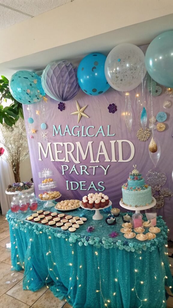 This stunning dessert table invites guests into a whimsical underwater world, embodying the spirit of a magical mermaid birthday party. A vibrant sequined tablecloth in shimmering teal evokes the ocean, adorned with delicate string lights for a captivating glow. The backdrop proudly proclaims “Magical Mermaid Party Ideas,” setting a charming tone.