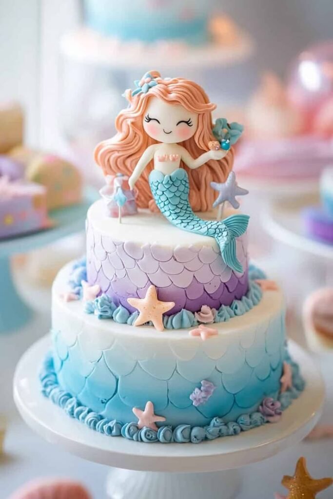 The cake layers feature a beautiful scale pattern, transitioning from soft blue at the bottom to lovely purple and pink on the top tier. Edible starfish, seashells, and tiny coral details are scattered around the cake, enhancing the underwater theme. This cake is both visually stunning and sure to be delicious.
