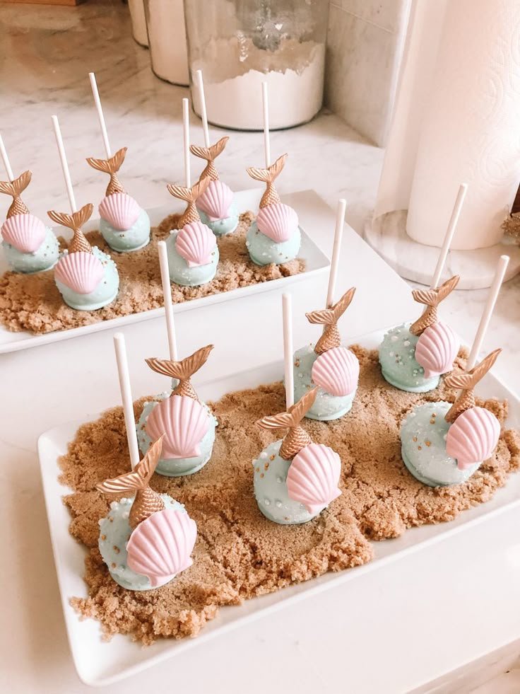 These adorable cake pops are a charming and delicious treat, making them a fantastic addition to any mermaid birthday party. Each pop features a delicate aqua blue coating, adorned with tiny white sprinkles to mimic sea foam. Perched on top are beautifully crafted edible elements: shimmering golden mermaid tails and soft pink seashells.