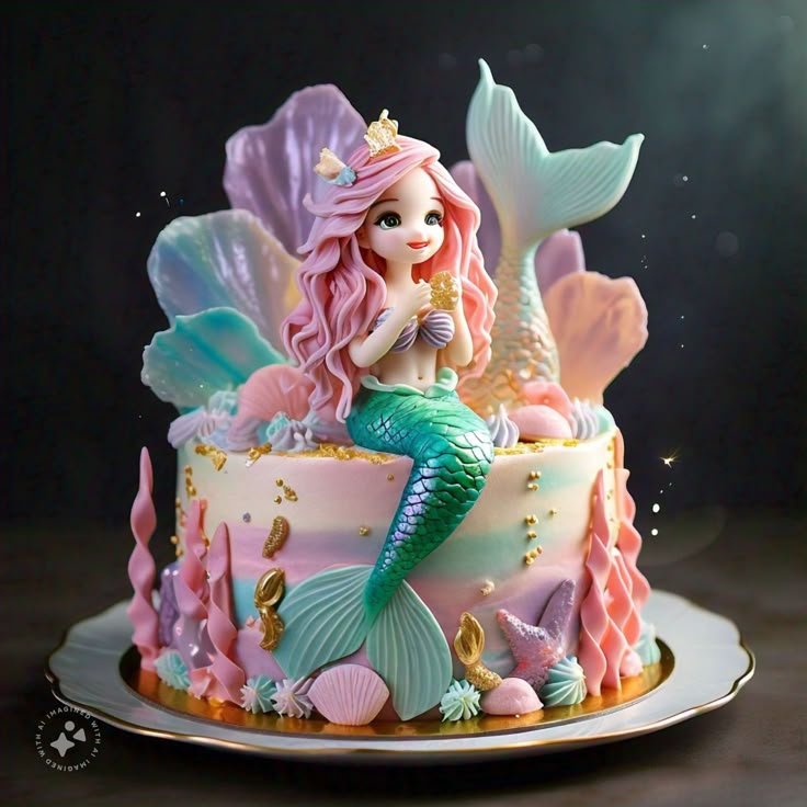 This stunning multi-tiered cake makes a spectacular centerpiece for any mermaid birthday party. Adorned with shimmering mermaid tails, delicate seashells, and intricate coral details, it truly captures the magic of the deep sea. The elegant color palette of soft pinks, blues, and golds adds to its visual appeal.
