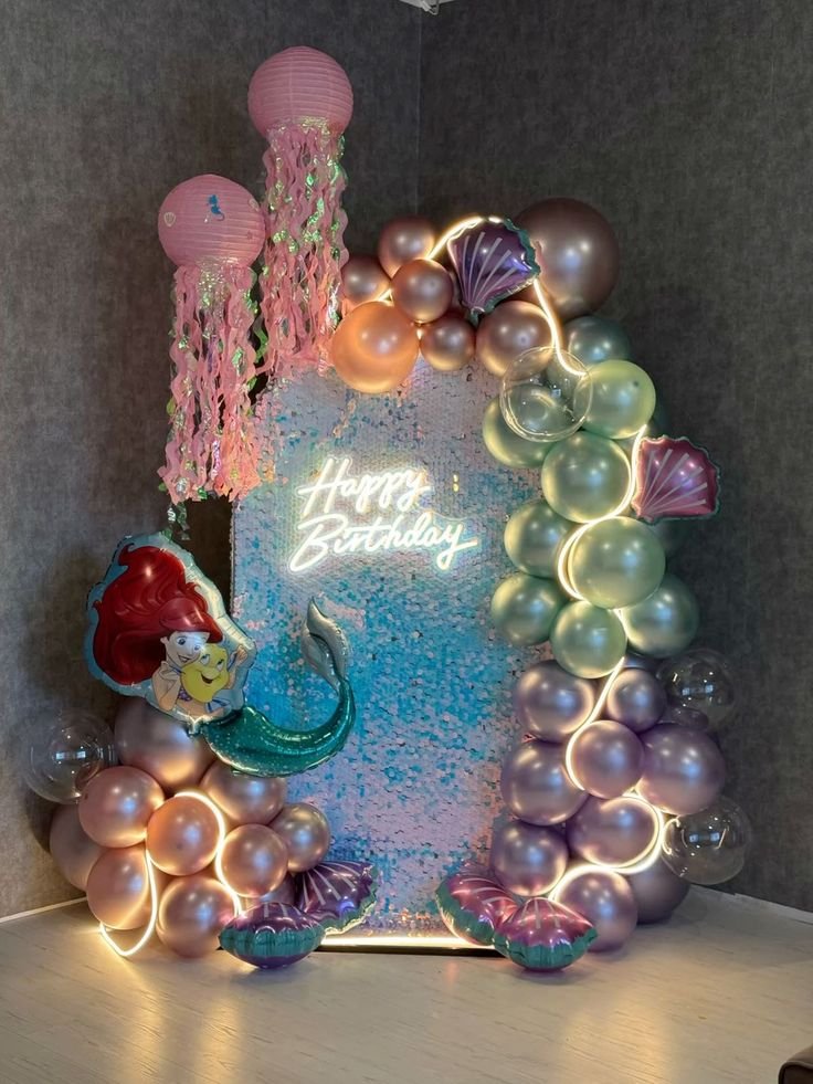This captivating setup offers a radiant backdrop for a mermaid birthday party, exuding underwater charm. A shimmering sequin board in blue and pink hues creates a dazzling effect, illuminated by a glowing “Happy Birthday” neon sign. A large foil balloon of Ariel and Flounder adds a familiar and cheerful touch.