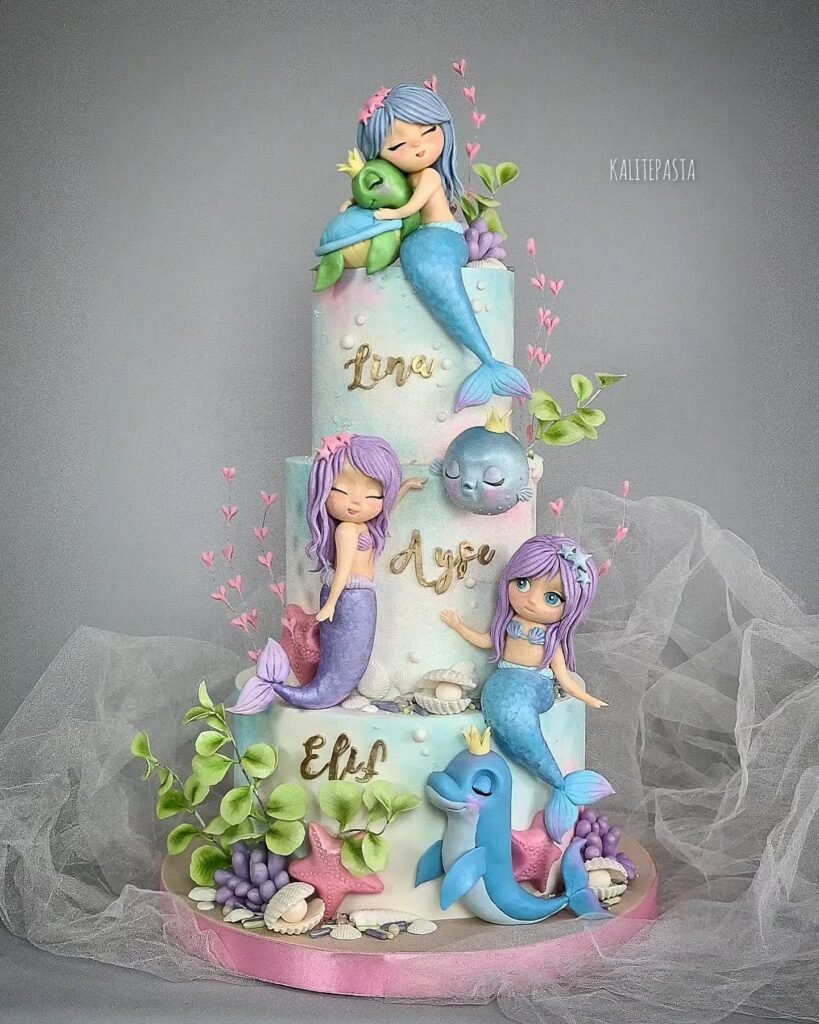 This enchanting tiered cake is an artistic centerpiece, truly capturing the essence of a charming mermaid birthday party. Each tier features beautifully sculpted mermaid figures, interacting with adorable sea creatures like a turtle, a dolphin, and a fish. The soft pastel blue and pink frosting evoke the gentle ebb and flow of ocean waves.