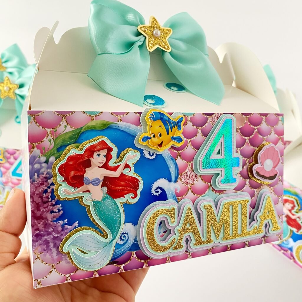 This delightful favor box is a fantastic addition to any mermaid birthday party, offering a charming way to send guests home with treats. The box features vibrant graphics of Ariel and her friend Flounder, set against a shimmering scale pattern. Glittering gold accents on the birthday child’s name, “Camila,” and the number “4” add a touch of sparkle.