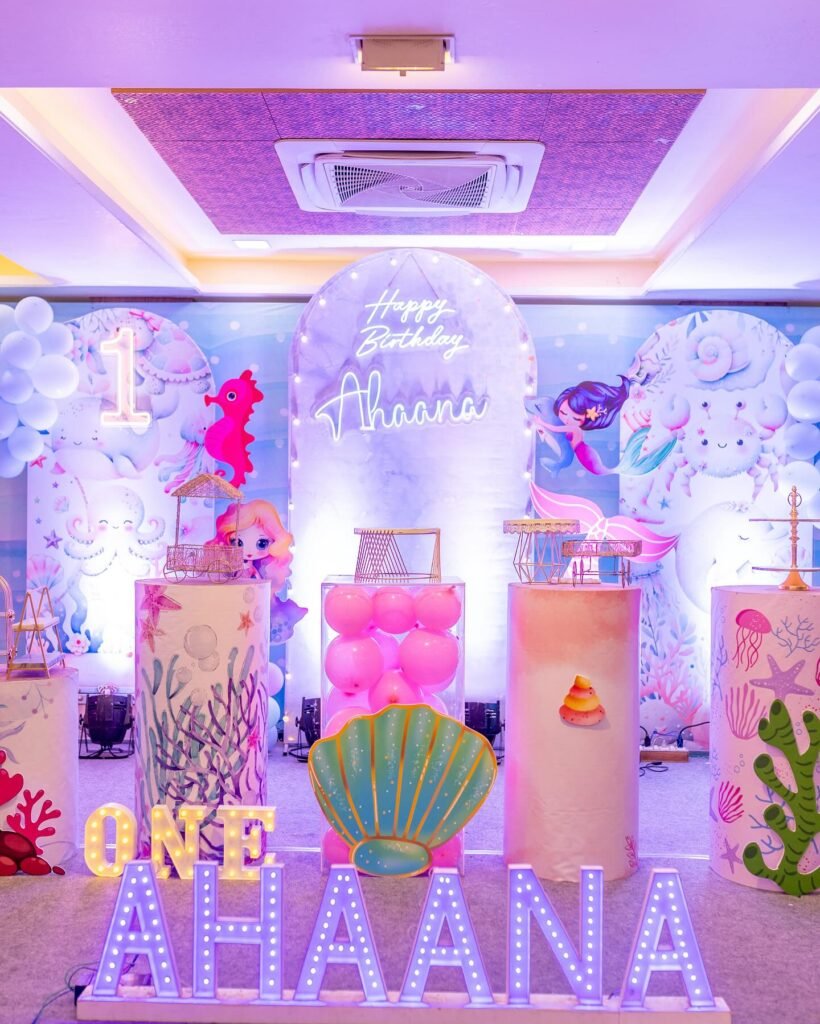 This delightful setup crafts an enchanting atmosphere, making it a wonderful choice for a mermaid birthday party, especially for a first birthday. A glowing “Happy Birthday Ahaana” neon sign, set within an arched backdrop, immediately draws the eye. Playful illustrations of octopuses and jellyfish adorn the walls, enhancing the oceanic charm.