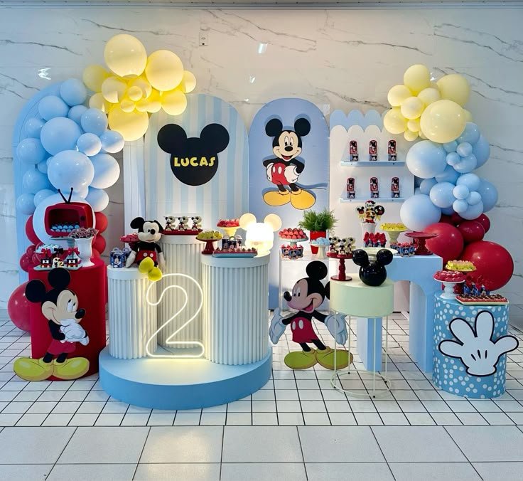 Step into a world of wonder with this delightful Mickey Mouse birthday party setup, perfect for a two year old’s special day. The vibrant blue and yellow balloon arches frame a captivating scene, featuring classic Mickey imagery and a personalized touch for Lucas. Guests will adore the various character cutouts, creating an immersive atmosphere that brings the beloved cartoon to life. Every detail contributes to a truly memorable celebration.