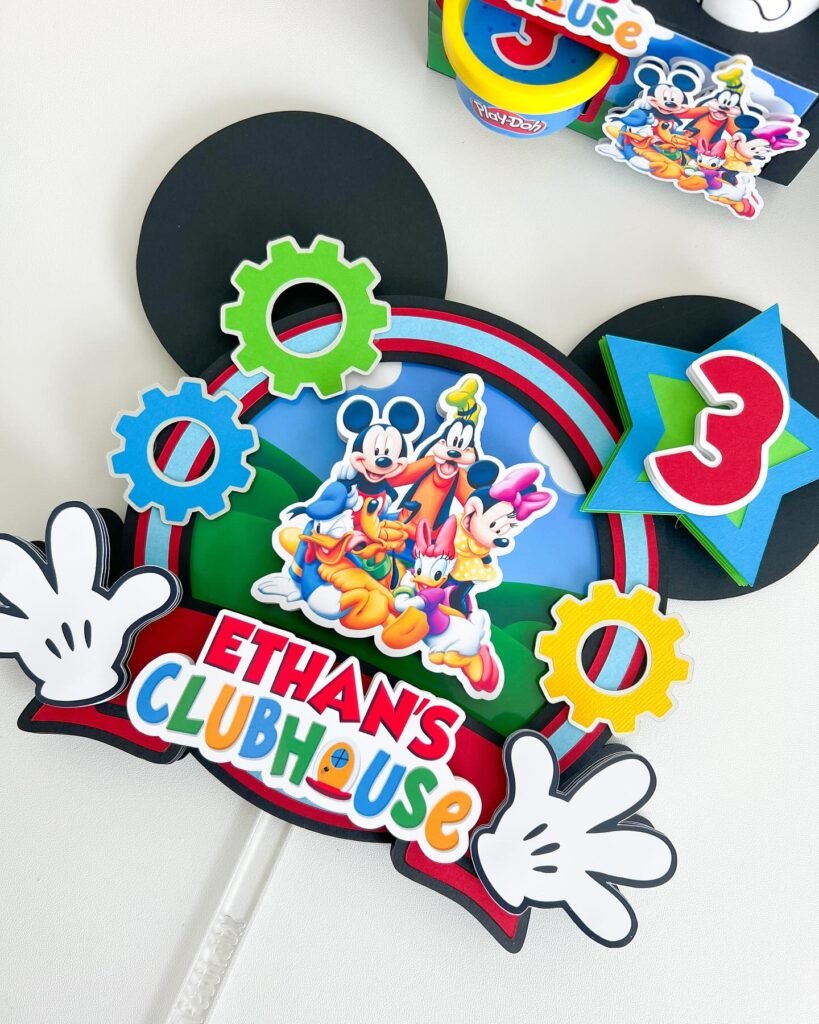 A bright red number “3” is cleverly integrated into a star shape, making the age clear and festive. The black Mickey ear silhouettes in the background reinforce the overall theme. This detail rich topper proves that even small additions can make a huge impact on the overall presentation of a Mickey Mouse birthday party. It is both fun and beautifully crafted.