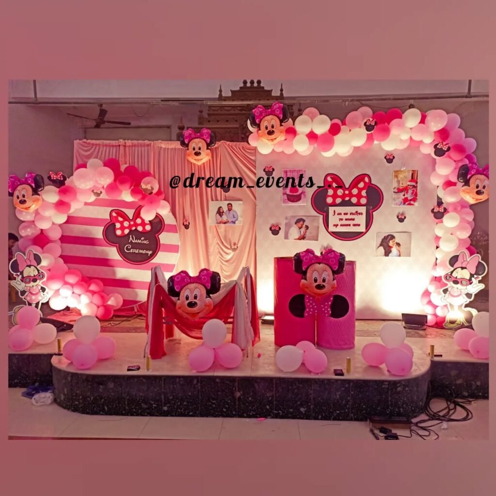 The backdrop features a lovely mix of striped fabric and photo displays, showcasing cherished moments. A large Minnie silhouette announces “Naming Ceremony,” adding a personal touch to the event. Smaller Minnie cutouts stand on either side of the stage, enhancing the whimsical feel. This display highlights the versatility of the Mickey Mouse birthday party theme for various special occasions.