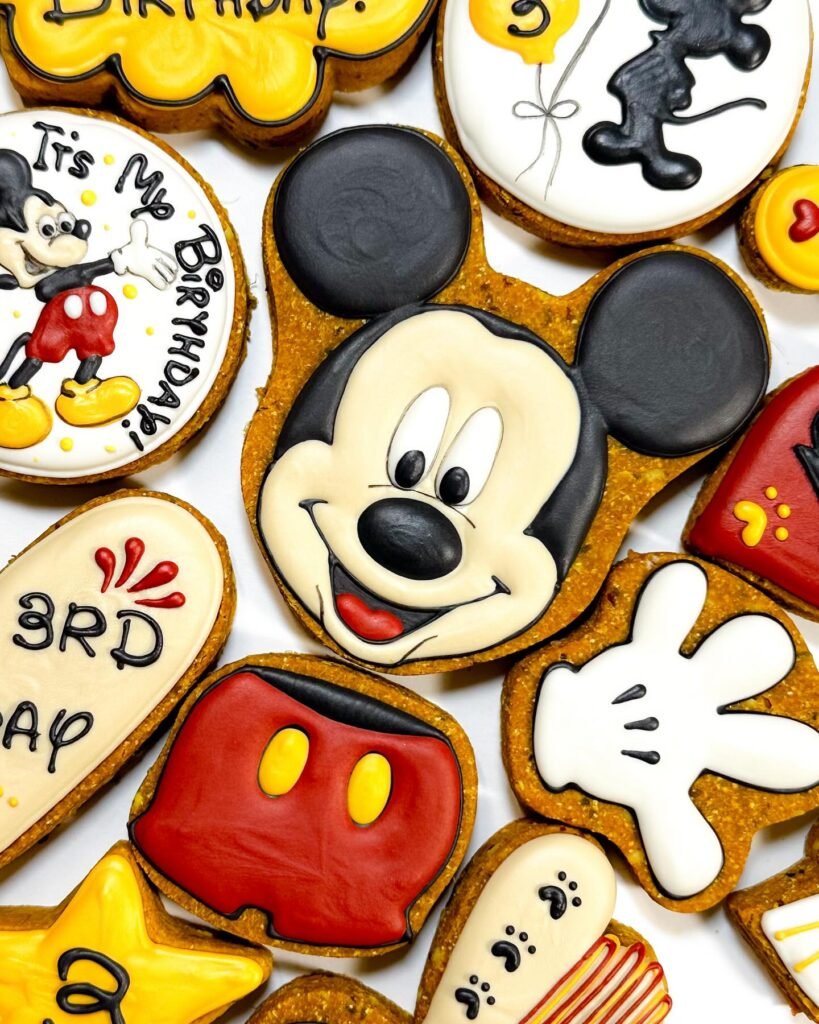 Among the assortment, you can spot cookies shaped like Mickey’s iconic red shorts with yellow buttons and his white gloved hand. Some round cookies declare “It’s My Birthday!” alongside a cheerful Mickey, while others denote “3RD BDAY” for a three year old. Even a ghostly cookie with paw prints adds a playful touch. Each design is a tiny piece of edible art.