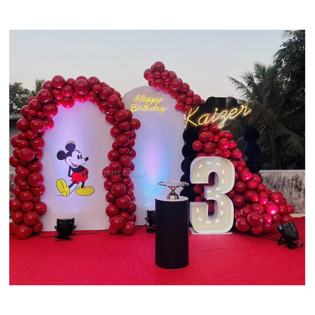 The backdrop includes a radiant “Happy Birthday” neon sign and a personalized “Kaizer” in a stylish script, adding a modern touch. A large, illuminated number “3” indicates the special age being celebrated, a fantastic photo opportunity. Black balloons are integrated into the design on the right, providing a sleek contrast to the vibrant red. This color scheme is undeniably Mickey.